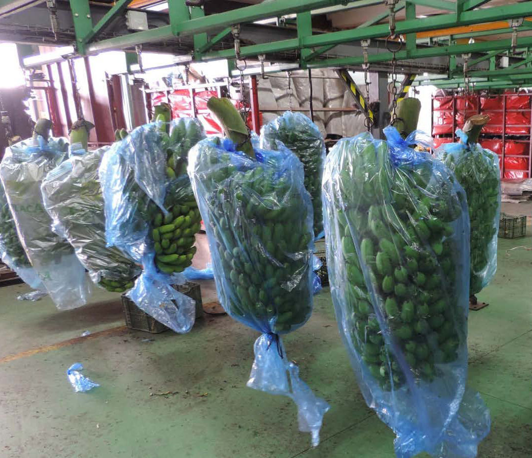 Tubo de polietileno natural o tratado, con perforaciones utilizado para envolver el racimo de plátano, esta bolsa se pigmenta ya sea de color azul o blanco. De ancho se empaca en rollo de 40 a 45kg. Fabricado con resina virgen sus atributos es proteger los racimos de banano contra plagas de insectos y sirve como efecto invernadero para el crecimiento del fruto.